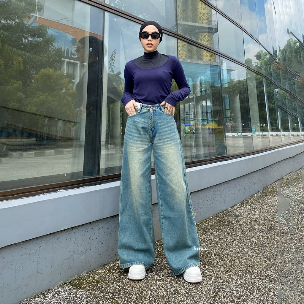 celana jeans wanita jiniso jumbo high waist cutbray kulot sobek cargo pants jumbo Loose WEEKEND jiniso official store