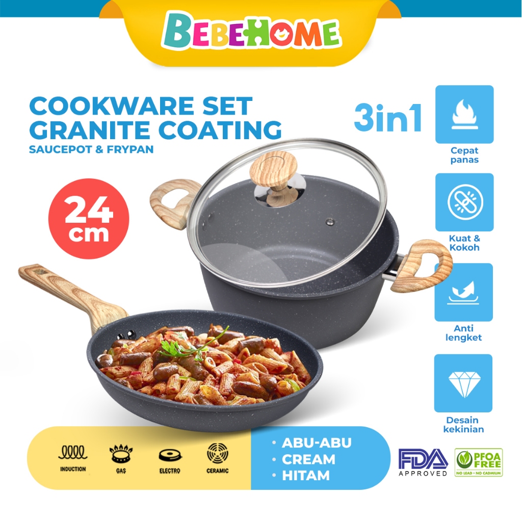 BEBEHOME X Tifale Celeste 3in1 Set Dark Grey Granite Casserole Frypan Saucepot 24CM Anti Lengket