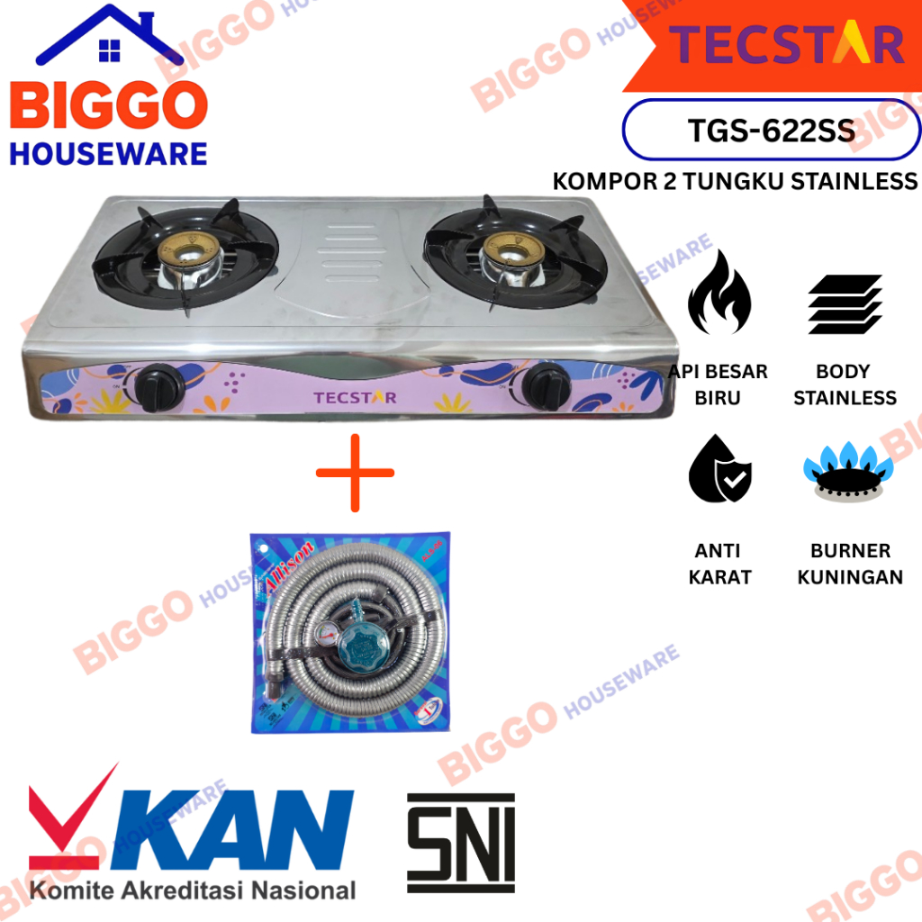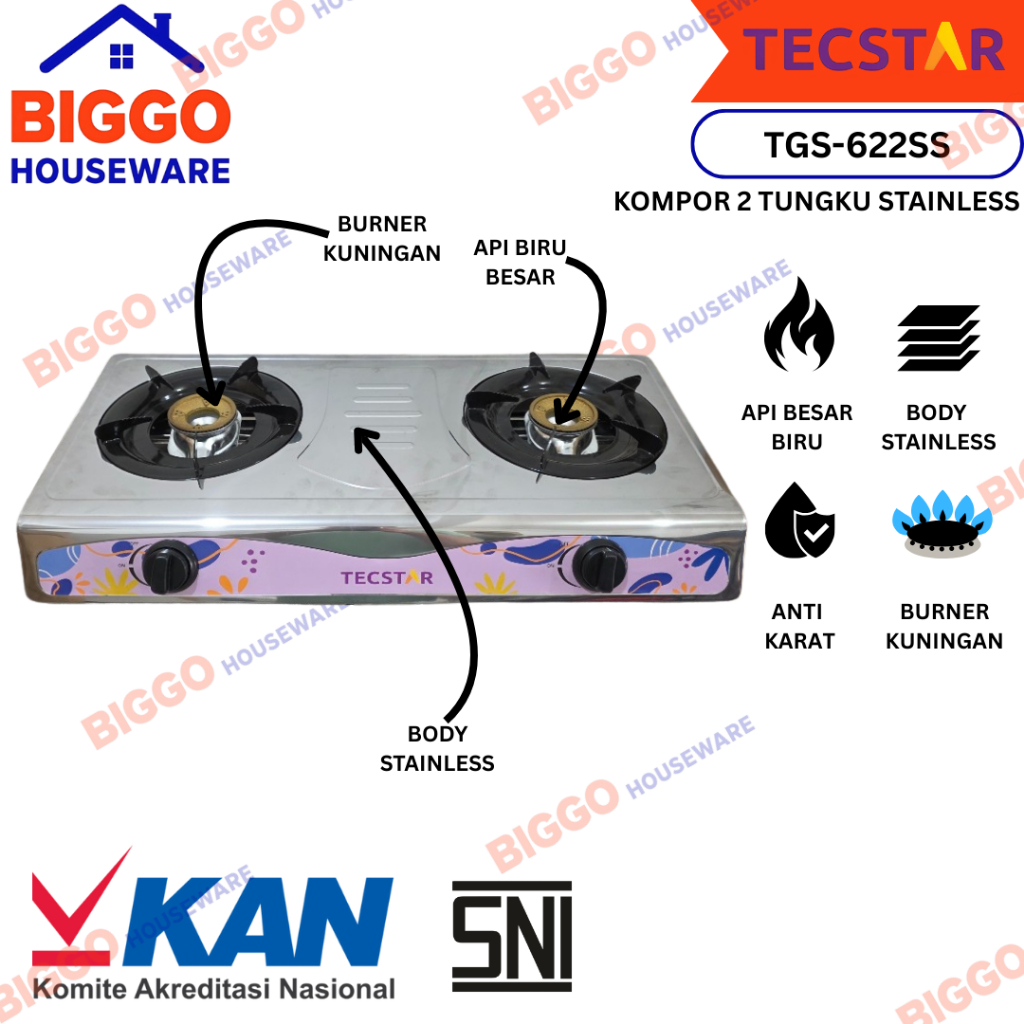 TECSTAR Kompor Gas 2 Tungku Stainless TGS-622SS/Kompor Gas 2 Tungku TECSTAR Stainless Anti Karat,SNI