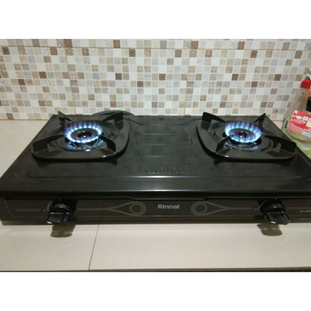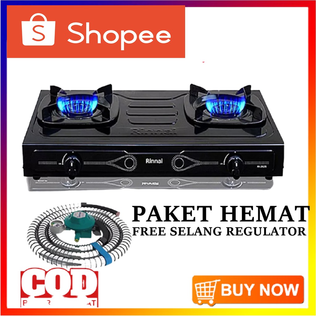Kompor Gas 2 Tungku RINNAI RI 202S+Selang Gas+regulator Meter Bahan Sangat Kuat Hitam Teflon
