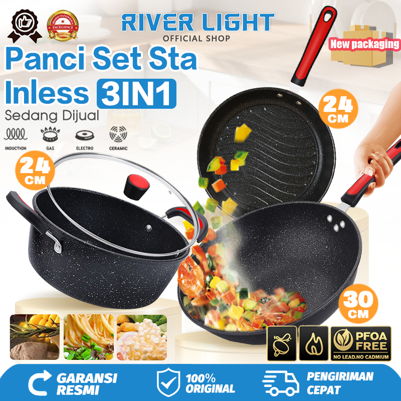 RIVER LIGHT Antilengket Peralatan Masak 3PCS Set Dark Grey Granite Casserole Frypan Saucepot 30CM Anti Lengket