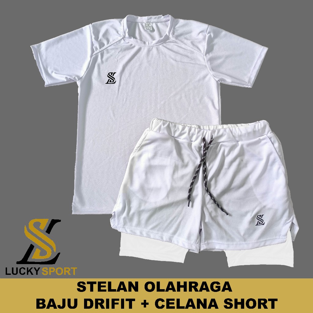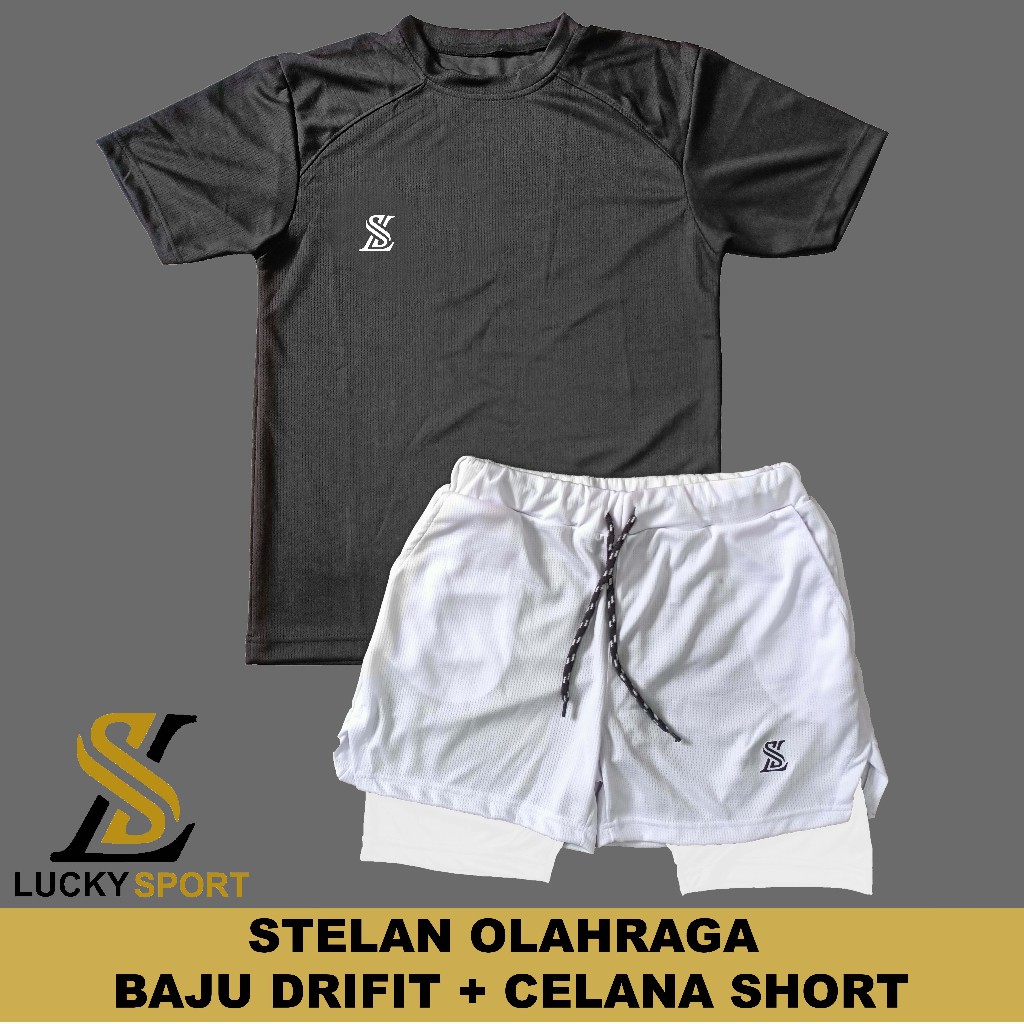 Setelan Olahraga Pria Double Layer 1 Set Baju Kaos Dryfit Celana Pakaian Outdoor Running Gym Lari Badminton Volly Futsal
