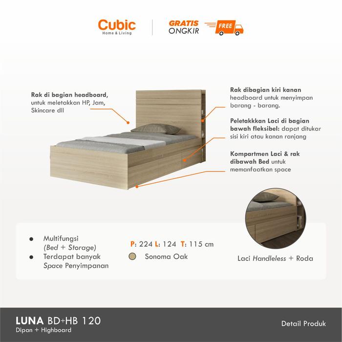 Cubic Dipan Kasur 120X200 / Ranjang Tempat Tidur / Luna Hbd 120 - Set Divan + Headboard