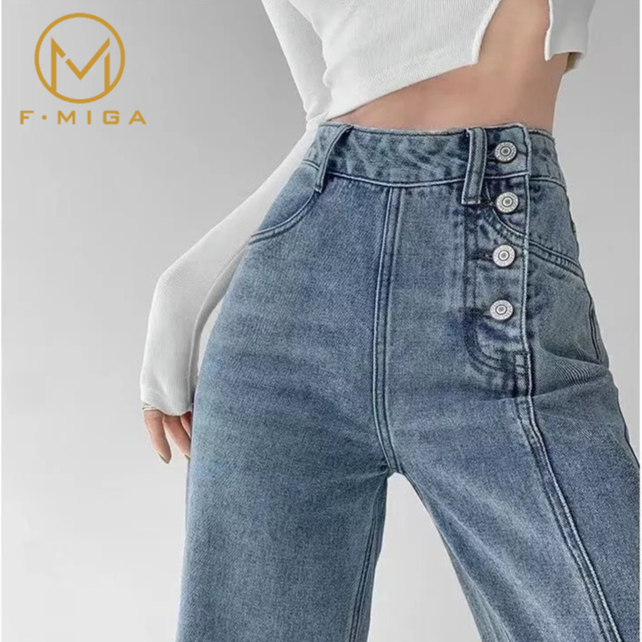 New Arrival Celana Jeans Wanita Musim Gugur, Side Button High Street Style, Lengan Tebal Panjang, Waist Tinggi, Ideal U
