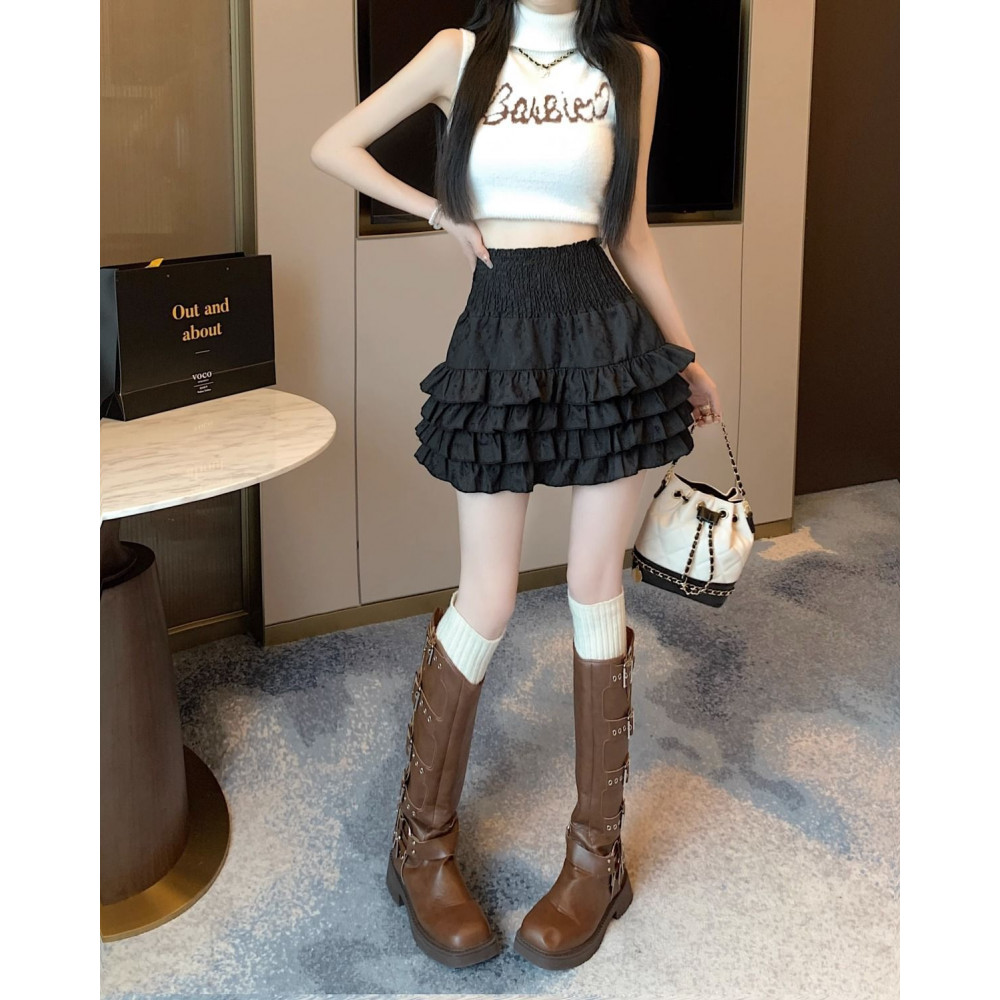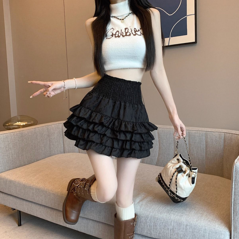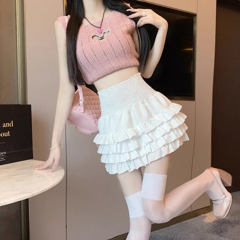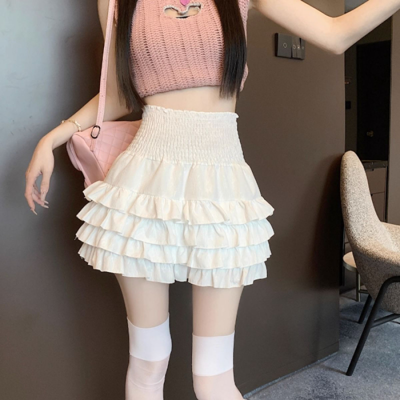 YURUMA Rok mini ramping pinggang tinggi gaya Korea dengan lapisan anti-eksposur dan rok kue renda