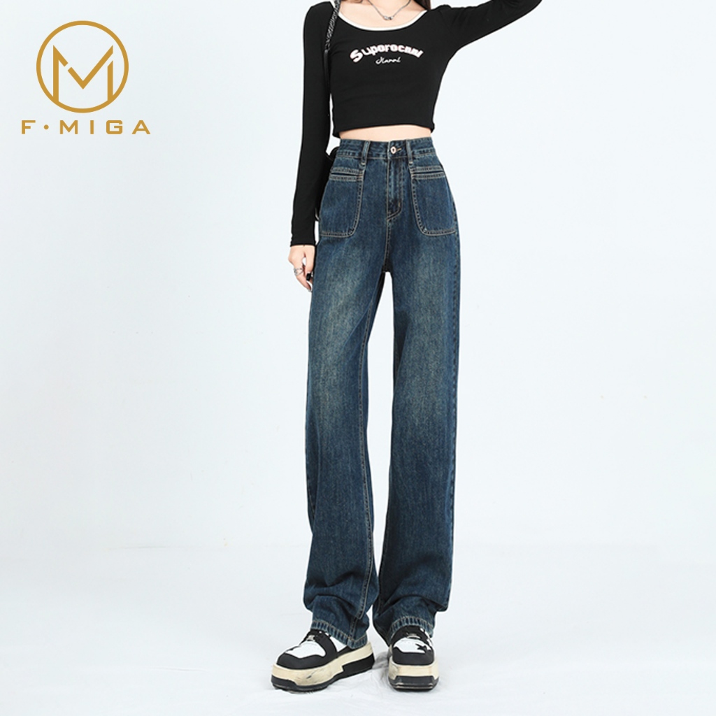 F·MIGA C132 Highwaist Korean Straight Bagy Jeans Celana Panjang Denim Wanita - Biru Retro