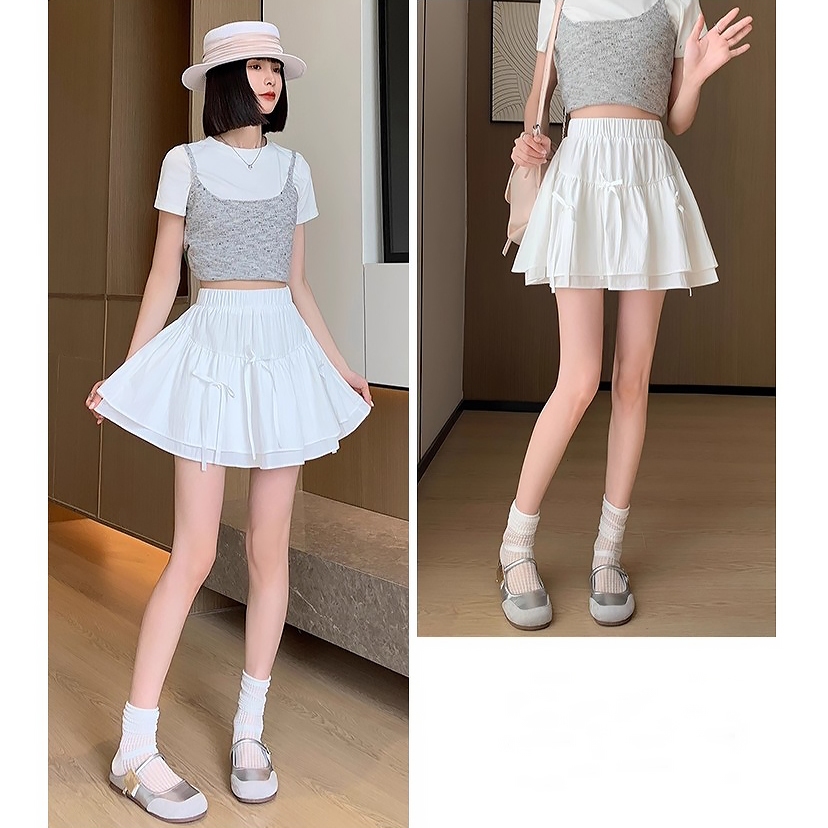 【Keygirl】Rok Pendek Manis Gaya Perancis Rok Mini Skirt Susun Pendek/A-line Lapisan rok span karet /Busur Musim Panas Rok