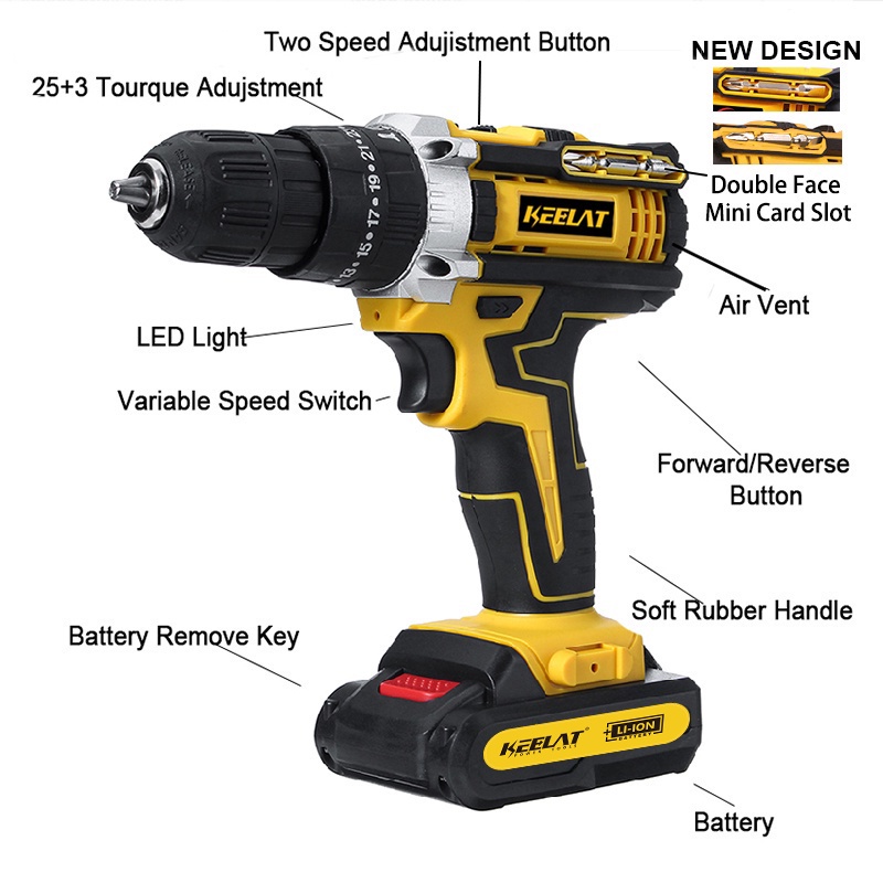 KEELAT-KCD005 10mm 20V Mesin Bor 2 MT Baterai Cordless Impact Drill Screwdriver Multifunction bor listrik Bor Beton Kayu