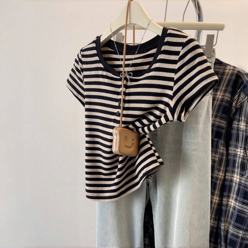 Kaos Crop Bergaris Cokelat/Kaos Lengan Pendek Elastis