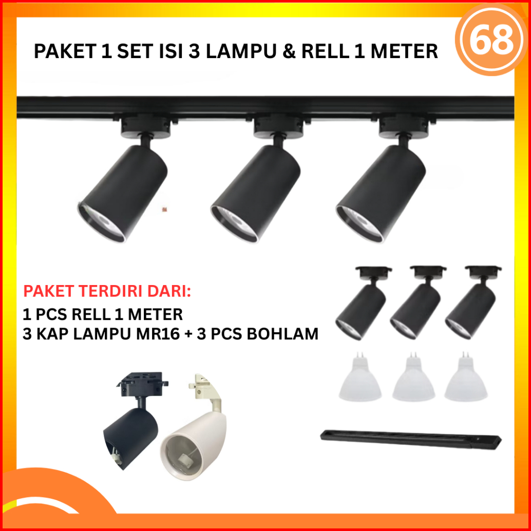 Paket Lampu Sorot Rel 1 Set Isi 3 Spotlight Rell Track Light E27 Mr16