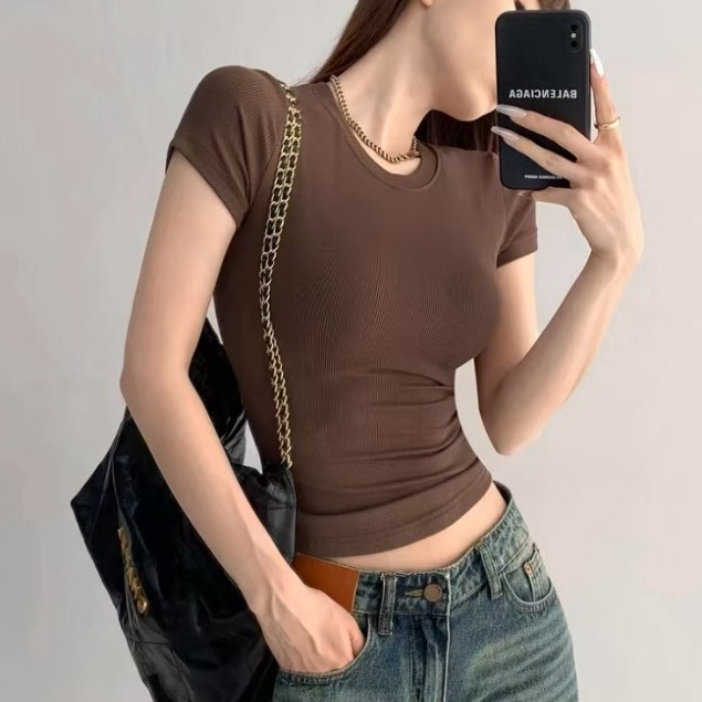 【Premium】99koutlet Atasan Cropped Wanita Short Sleeve Crew Neck Kaos Slim Fit Basic Tshirt Ribbed Polos (S/M/L/XL) 7302