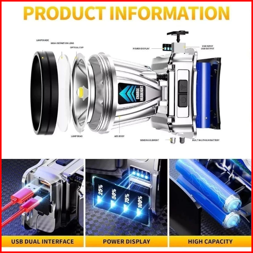 Senter Cas Super Terang Kepala Anti Air Senter Powerbank Jarak Jauh Super Led Baterai Lithium Super Terang Headlamp Supe
