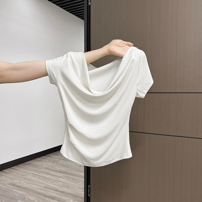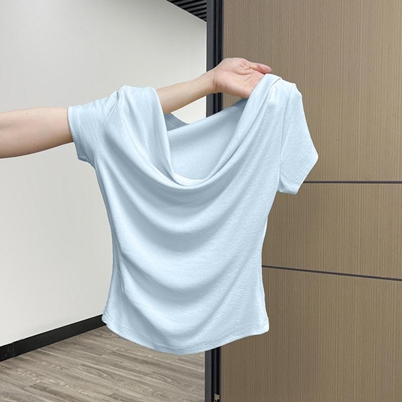 T-shirt Crop Top Lentur Kerutan Polos Satu Bahu Prancis/Baju Kaos Wanita Kekinian
