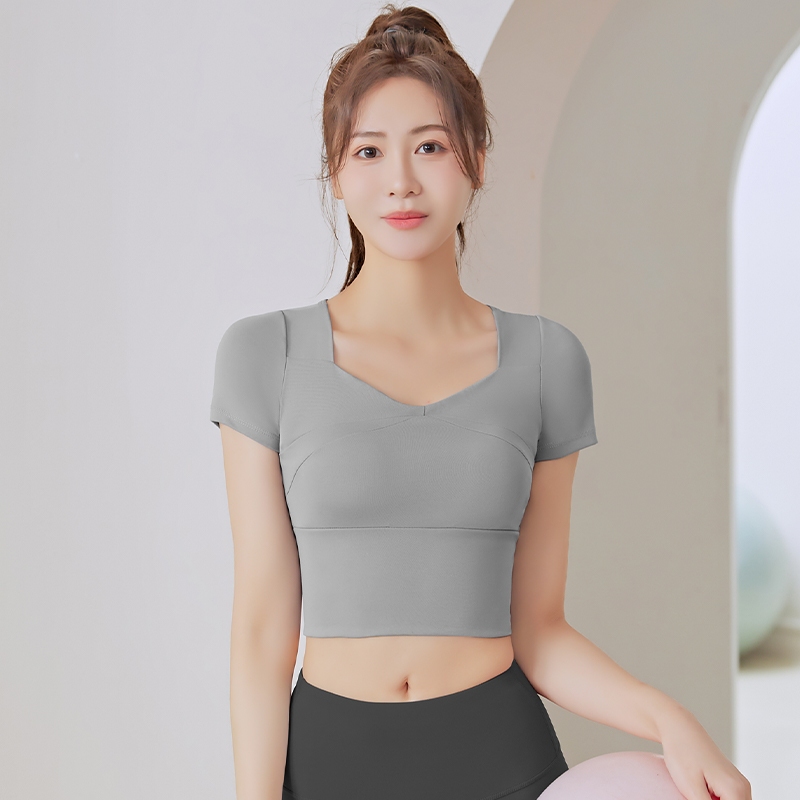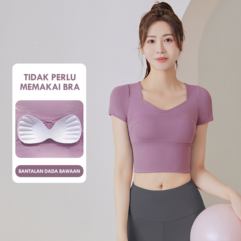 Baju Gym Kaos Olaraga Wanita Yoga Pilates Outfit Crop Top Lengan Pendek Fit Body Baju Senam Wanita Aerobic Terbaru Slimf