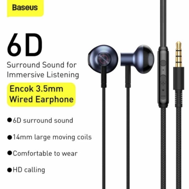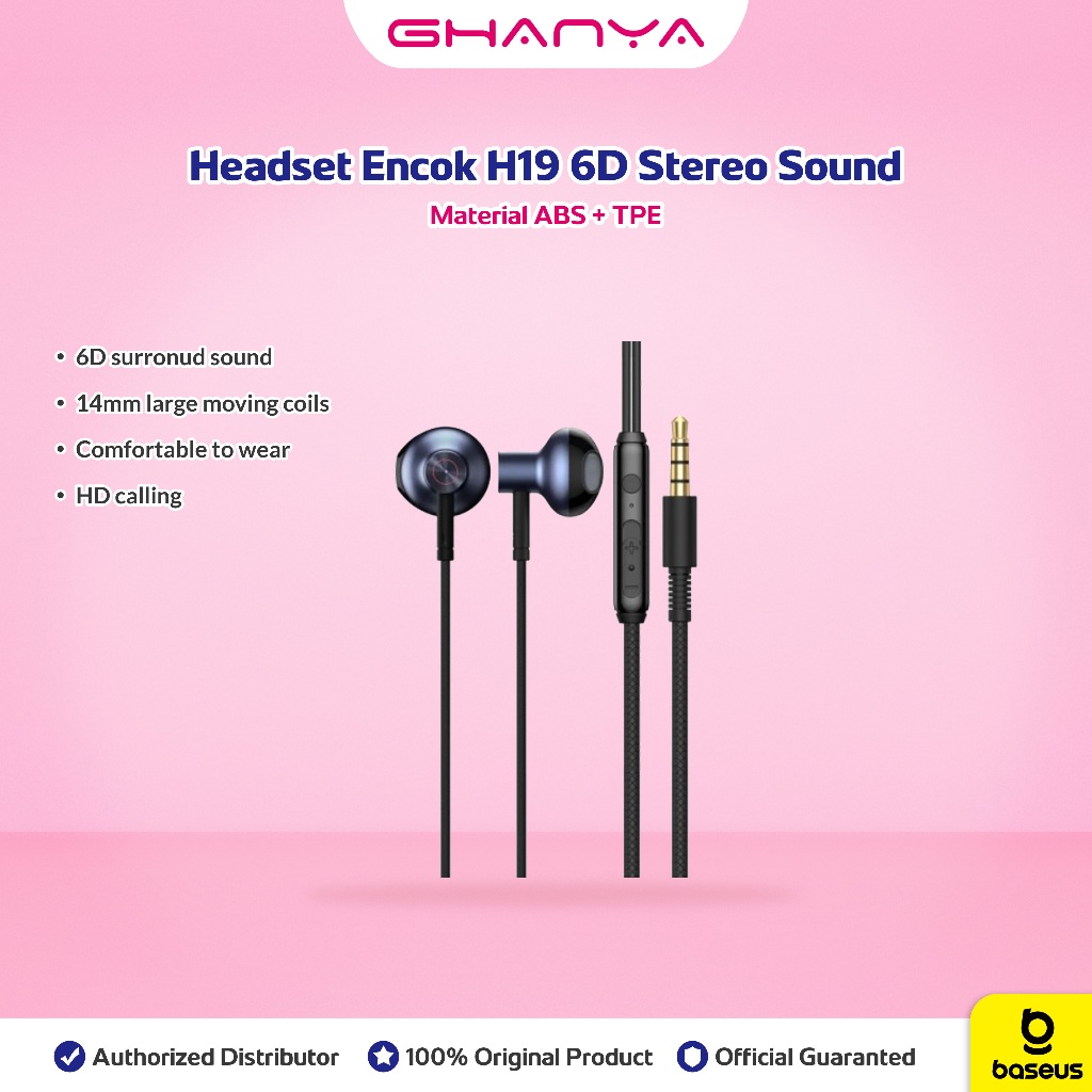 Baseus Original Headset Encok H19 6D Stereo Sound Wired Earphone Handsfree Kabel 3 5MM AUX Ori