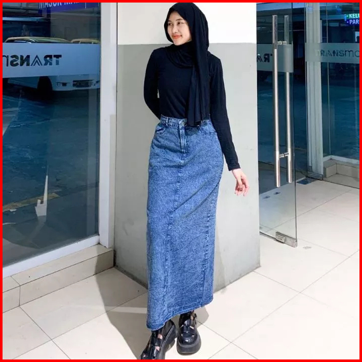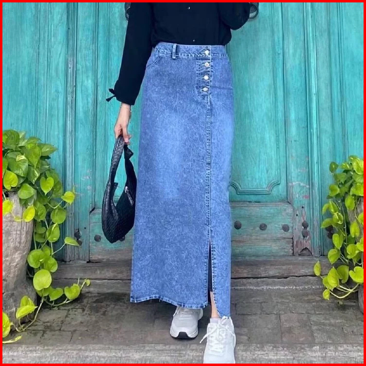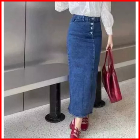 Rebecca Rok Jeans Highwaist Skirt Kancing Belah Samping Bahan Jeans Tebal