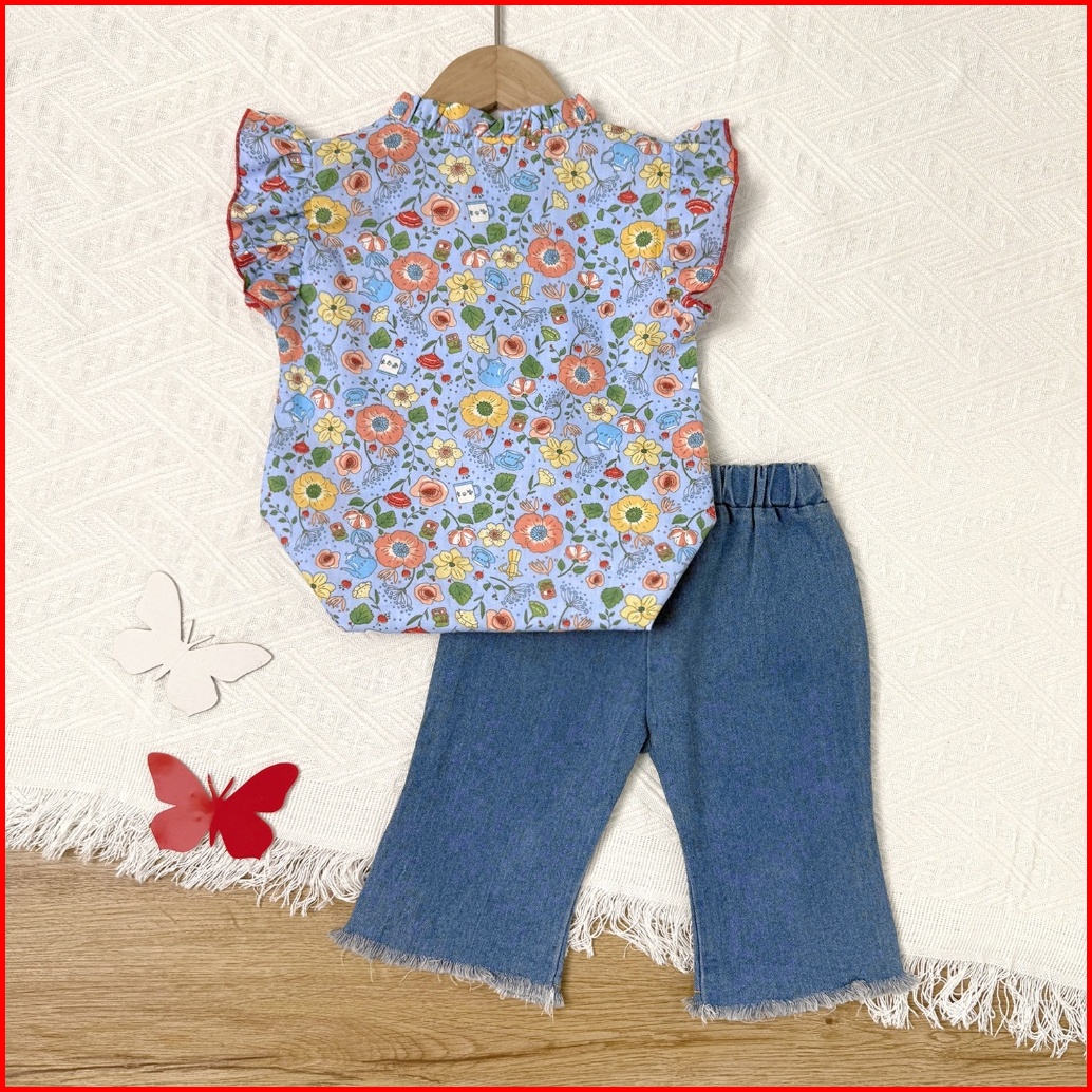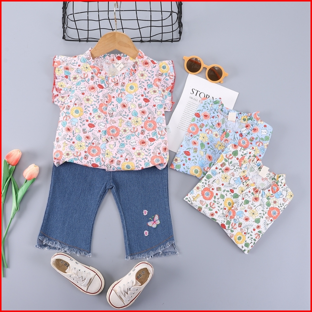 Kf Cat Setelan Anak Perempuan Set Lengan Pendek Celana Jeans Panjang Renda Kasual Style 1-4 Tahun