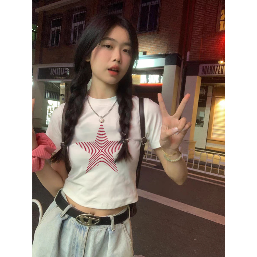 yiyoyi T-shirt Crop Top y2k Lengan Pendek Kaos Crop Wanita Cetakan Bintang Baju Atasan Wanita Terbaru Croptee Putih Kore