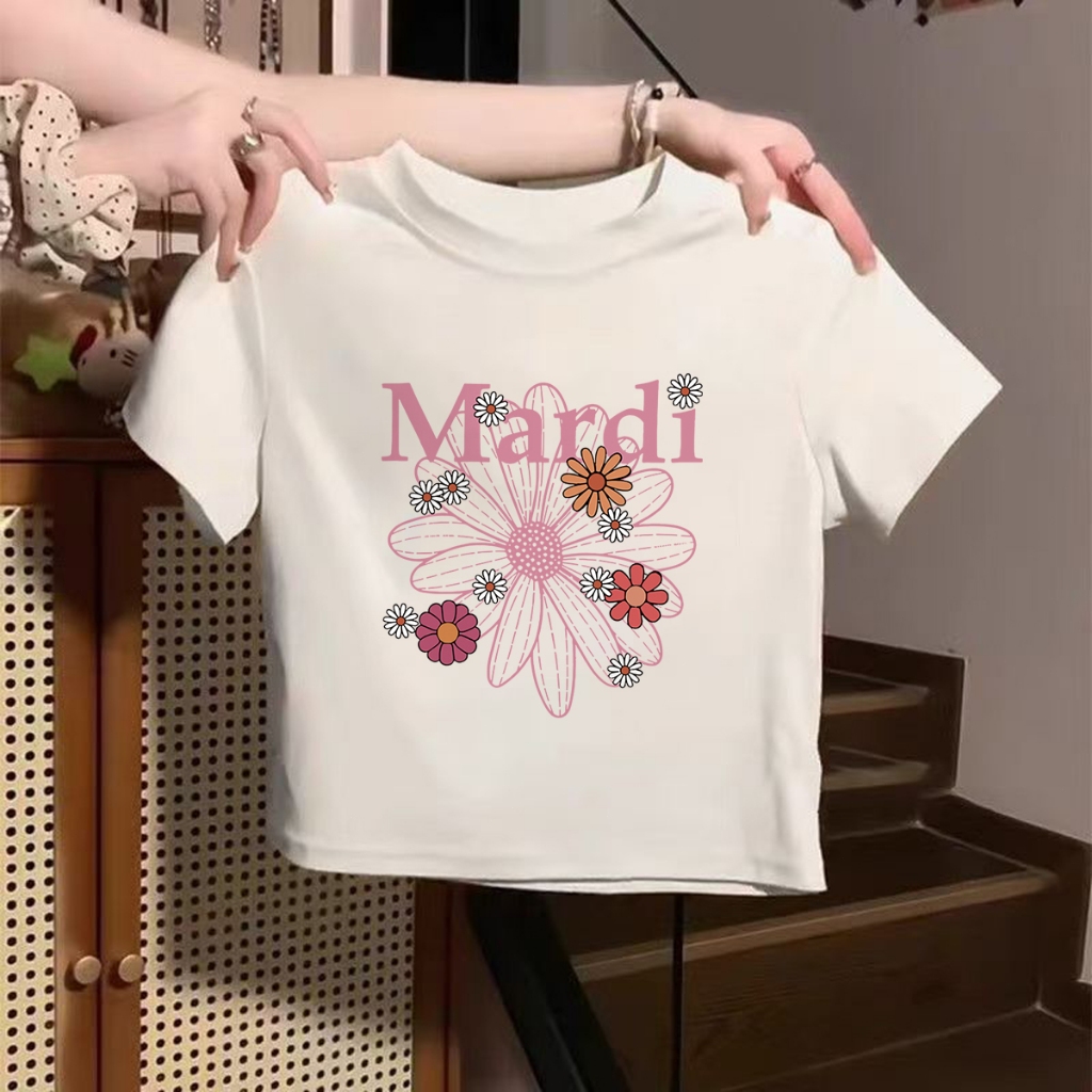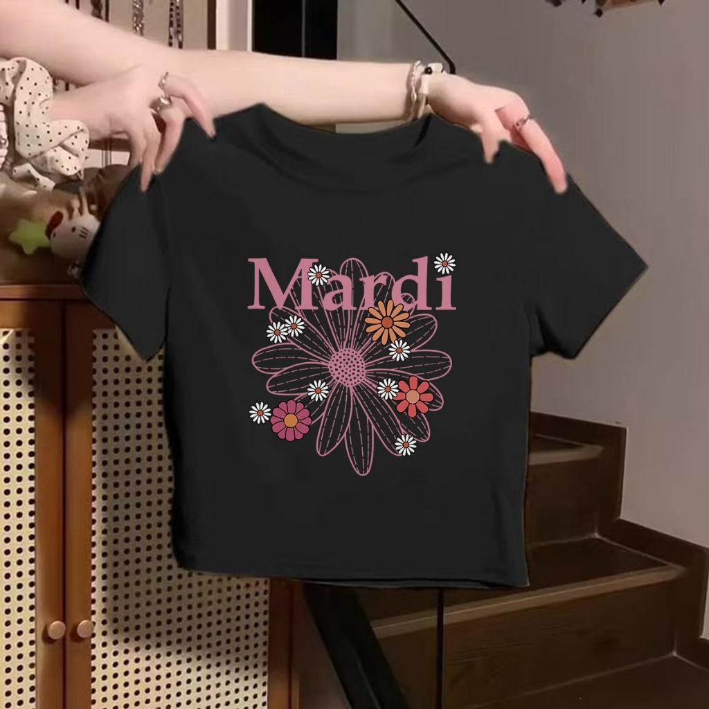 Premium Crop Top Kaos Wanita Korea - Slim Fit Mardi Daisy Printed - Baju Atasan Wanita Terbaru Original 100 PERSEN