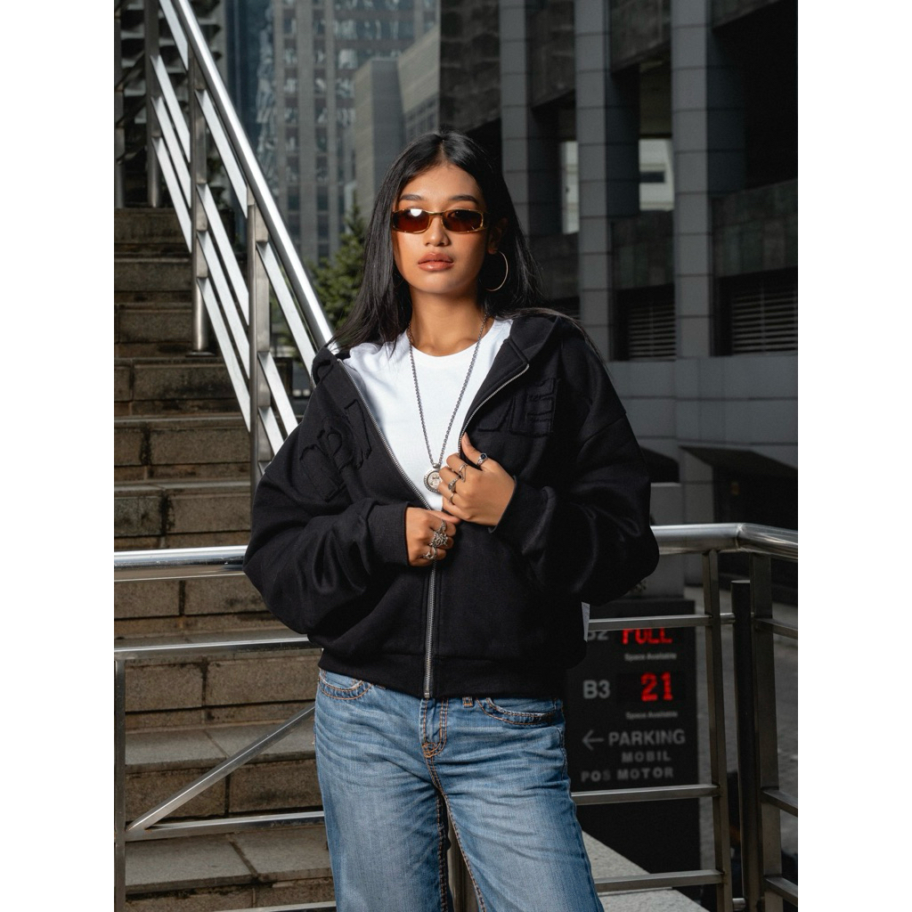 Monveir Zip Hoodie Black Boxy Fit Katun Fleece