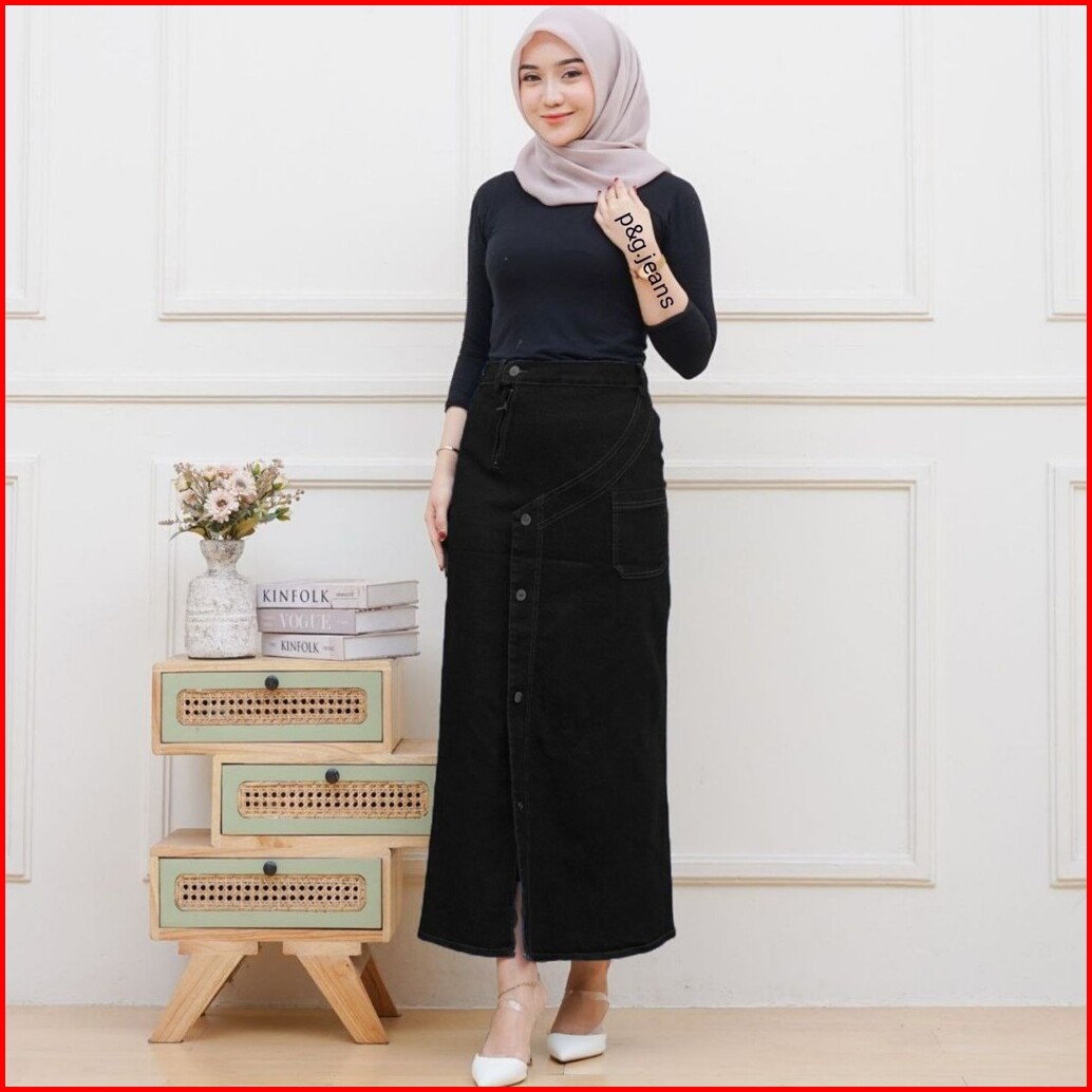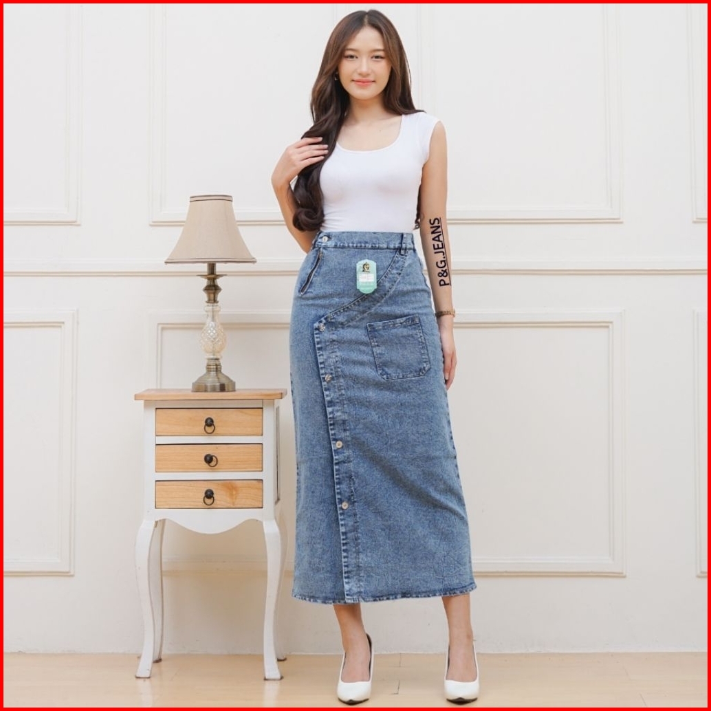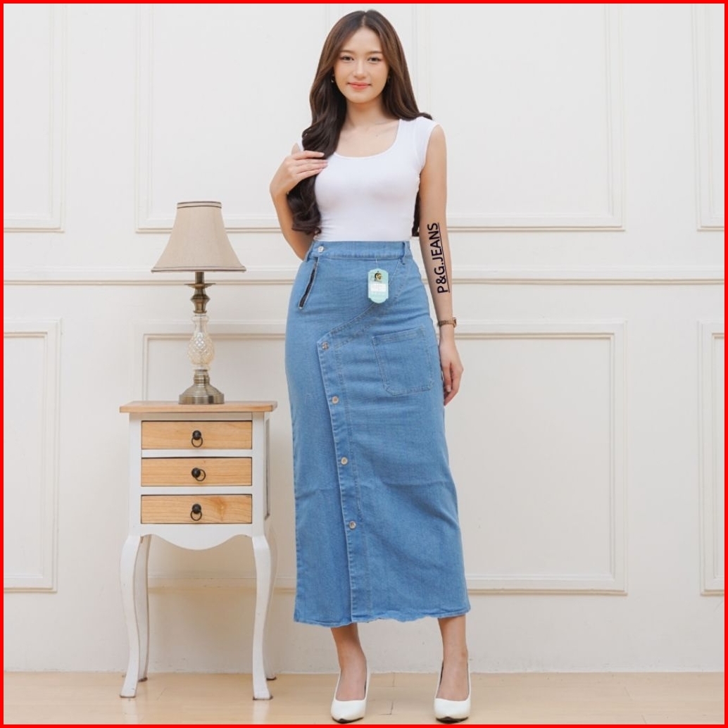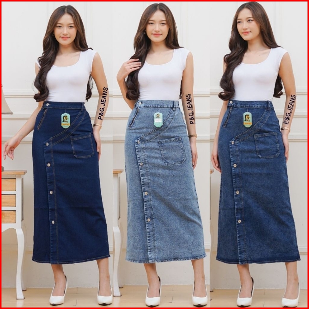 Pg Jeans - Nikita Rok Jeans Skirt Panjang Wanita Kancing Karet Belah Depan
