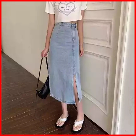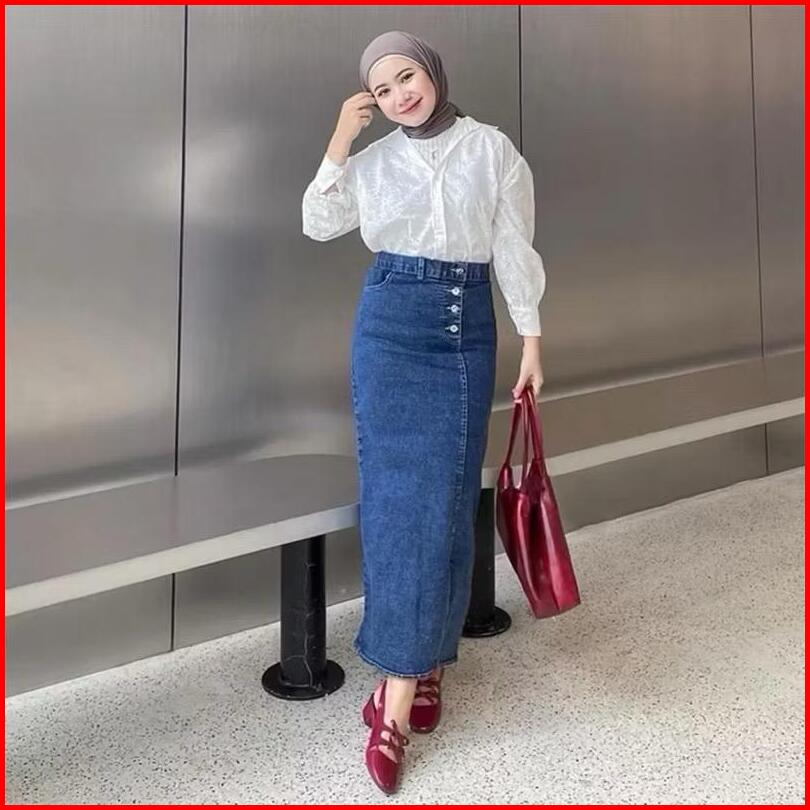 Rok Jeans Skirt Panjang High Waist Kancing Belah Samping Korean Style Kekinian - Azimah