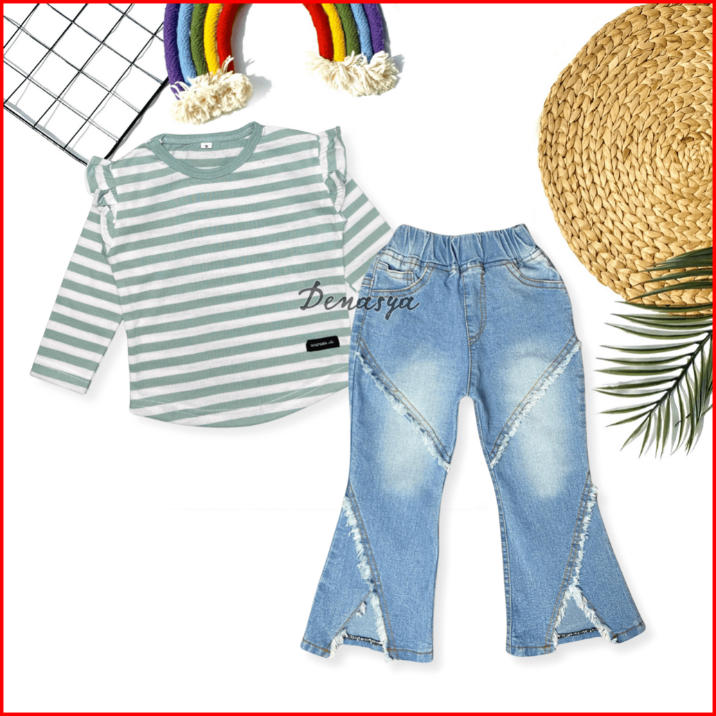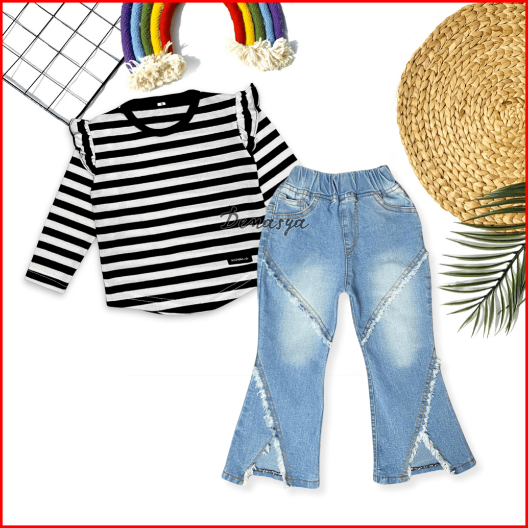 Setelan Cutbray Jeans Terbaru 2025 One Set Celana Jeans Anak Kekinian Atasan Kaos Ruffle Anak Usia 1-12 Tahun