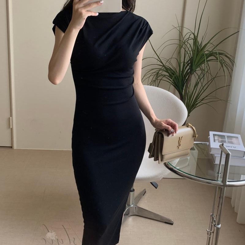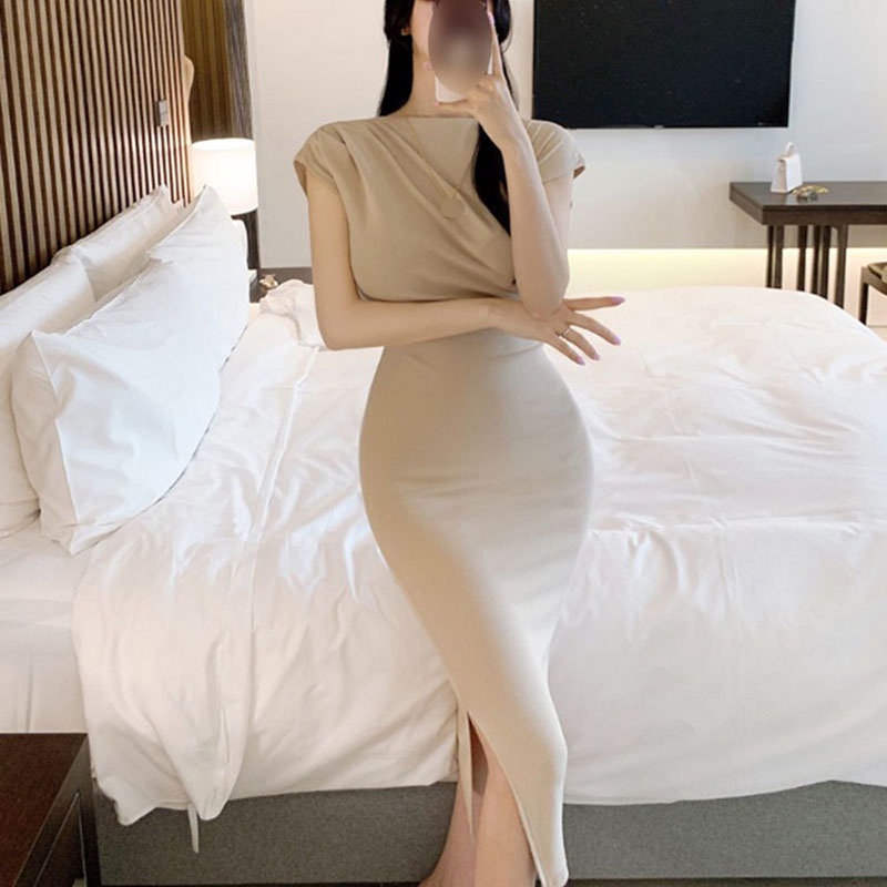 Newlan QZ070 Velvet Bodycon Dress Korean Midi Dress Short Sleeves Women Dress Midi Lengan Pendek Korean Long dress / Gau