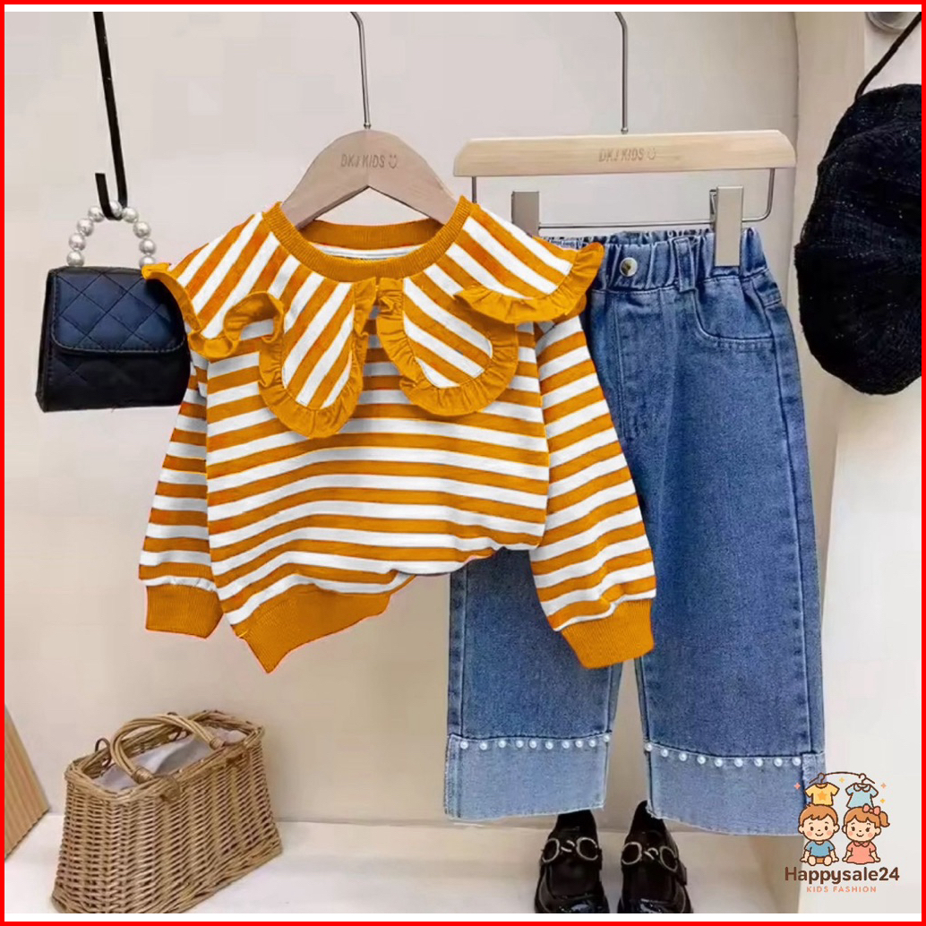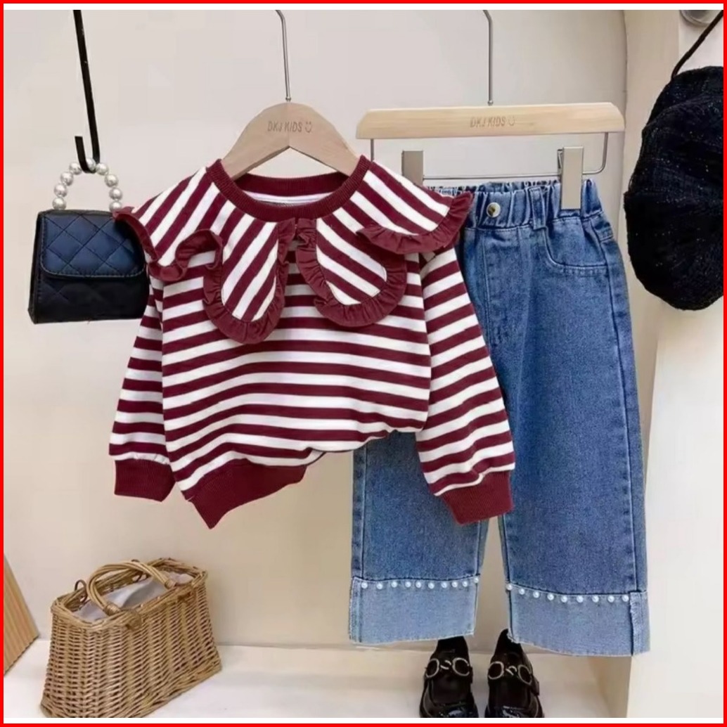 Setelan Anak Perempuan Lucu Usia 1-5 Tahun Atasan Ruffle Salur Cantik Celana Jeans Mutiara Fashion Anak Korean Style Out