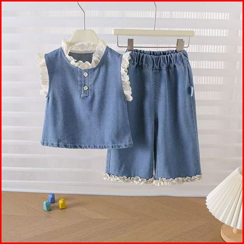 Setelan Denim Anak Perempuan 1-5 Tahun Atasan Tank Denim Celana Wide Leg Motify Besar Bahan Katun