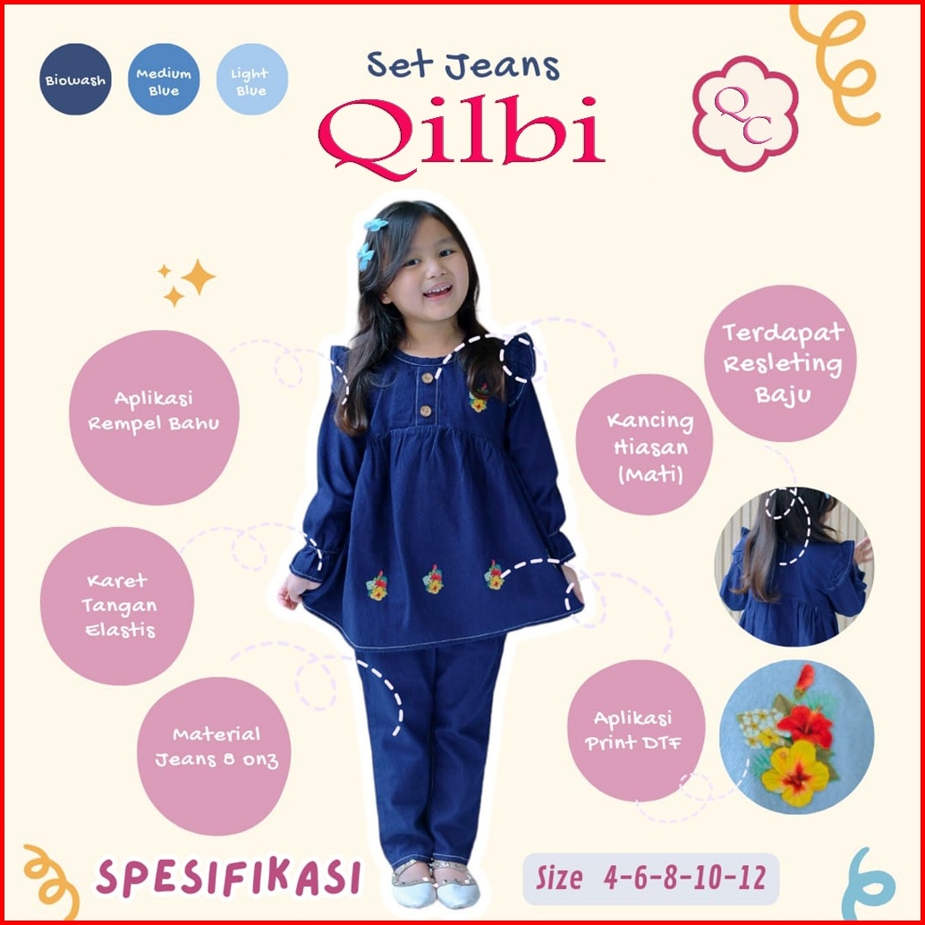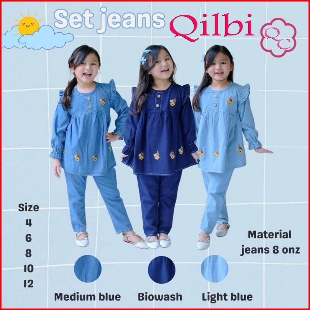 Qilbee - Setelan Denim Atasan Bawahan Jeans Anak Perempuan Usia 2 - 12 Tahun Bahan Premium Halus