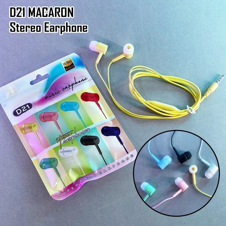 AM HEADSET HANDSFREE EARPHONE HF D21 MACARON SERIES EXTRA BASS PACKAGING IMPORT CANTIK DAN MURAH