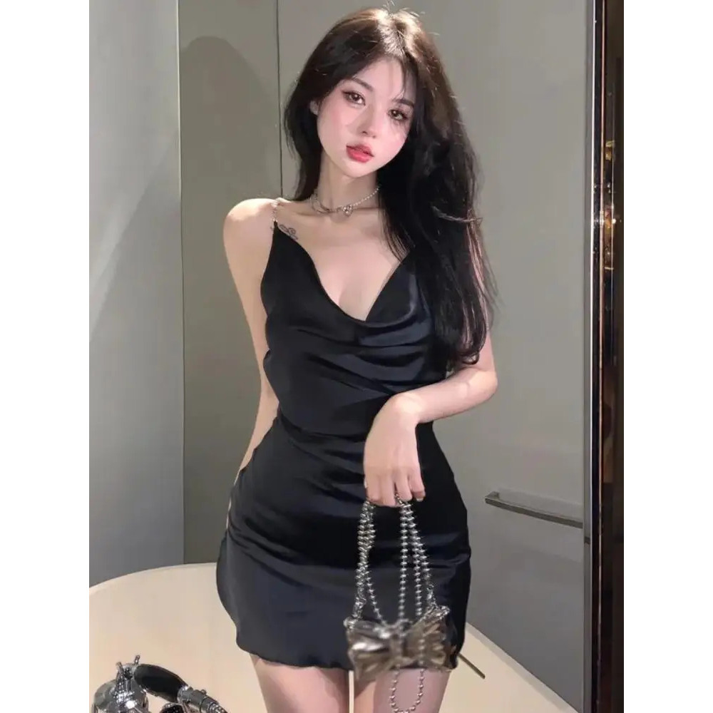 Gaun Satin Backless Tali Mutiara Seksi Wanita Membentuk Pinggul Punggung Terbuka W1086