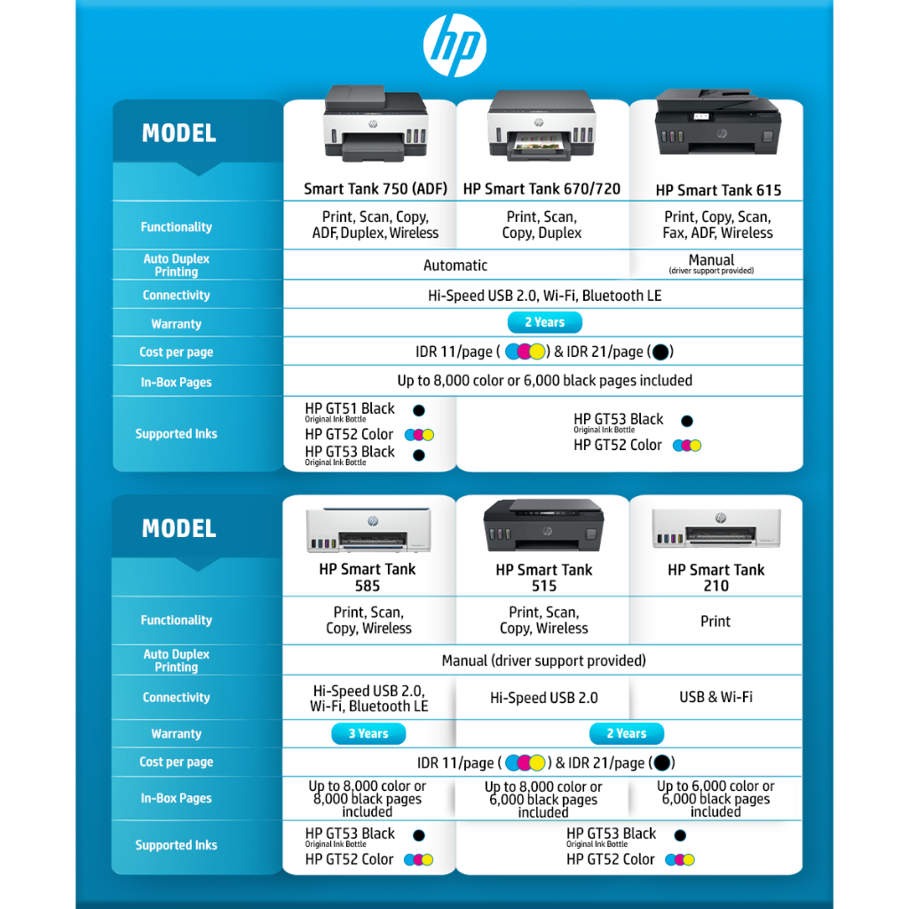 Printer HP Smart Ink Tank 210 / 520 / 585 / 615 Fax / 670 / 720 / 750 ADF / 790 / 215 All in One Print Scan Copy Wireles