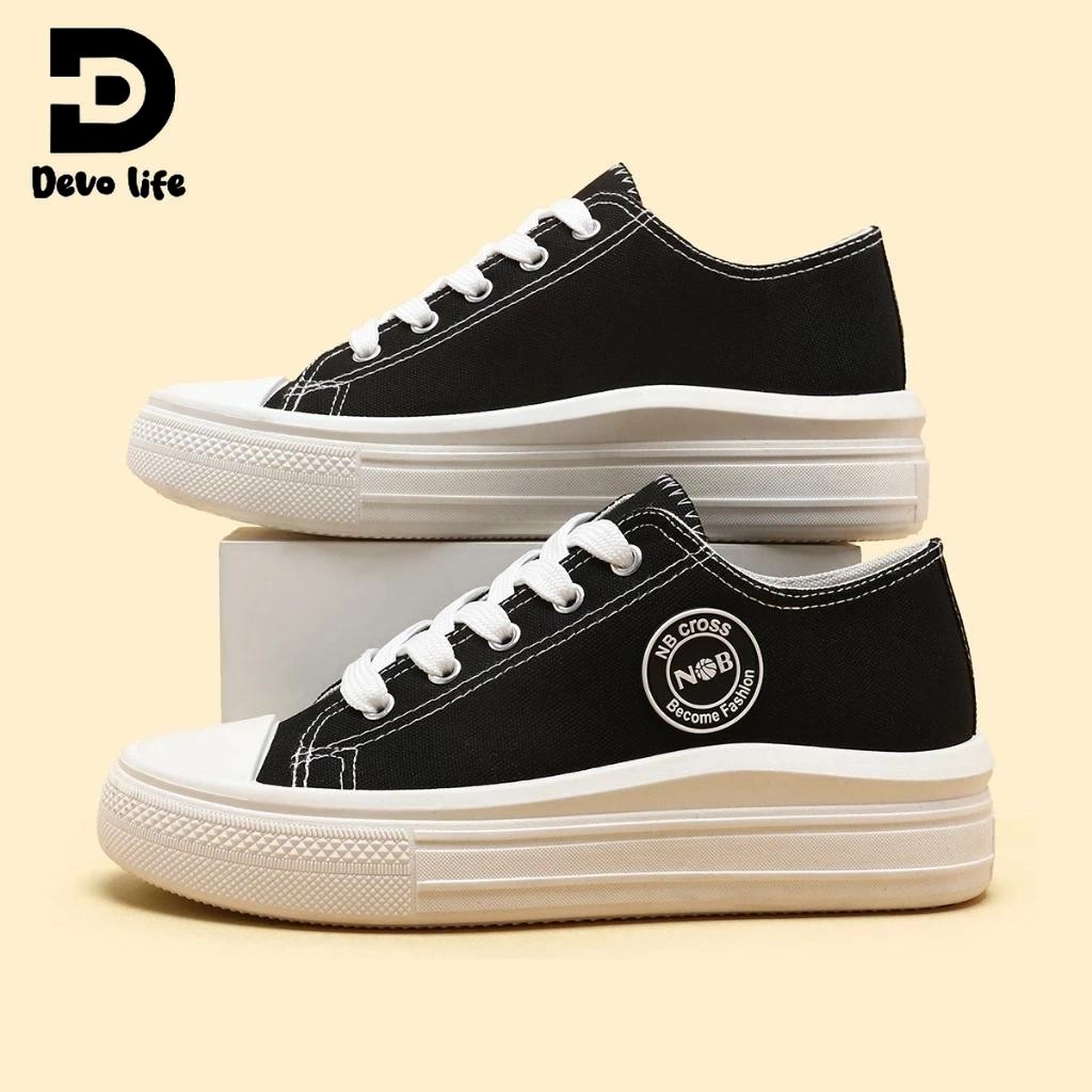 Devo Life - Sepatu Sneakers Wanita Sport Kasual High Kanvas Hitam Putih Sepatu Sekolah Kerja