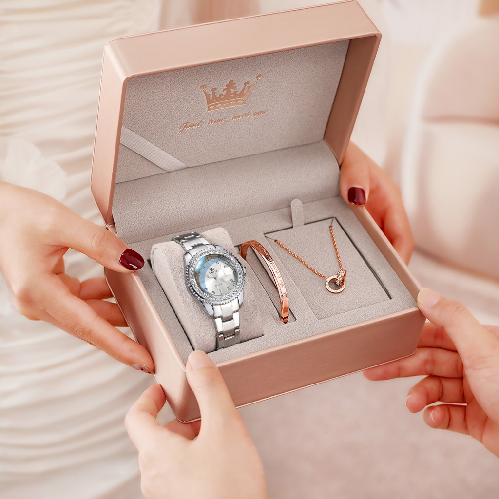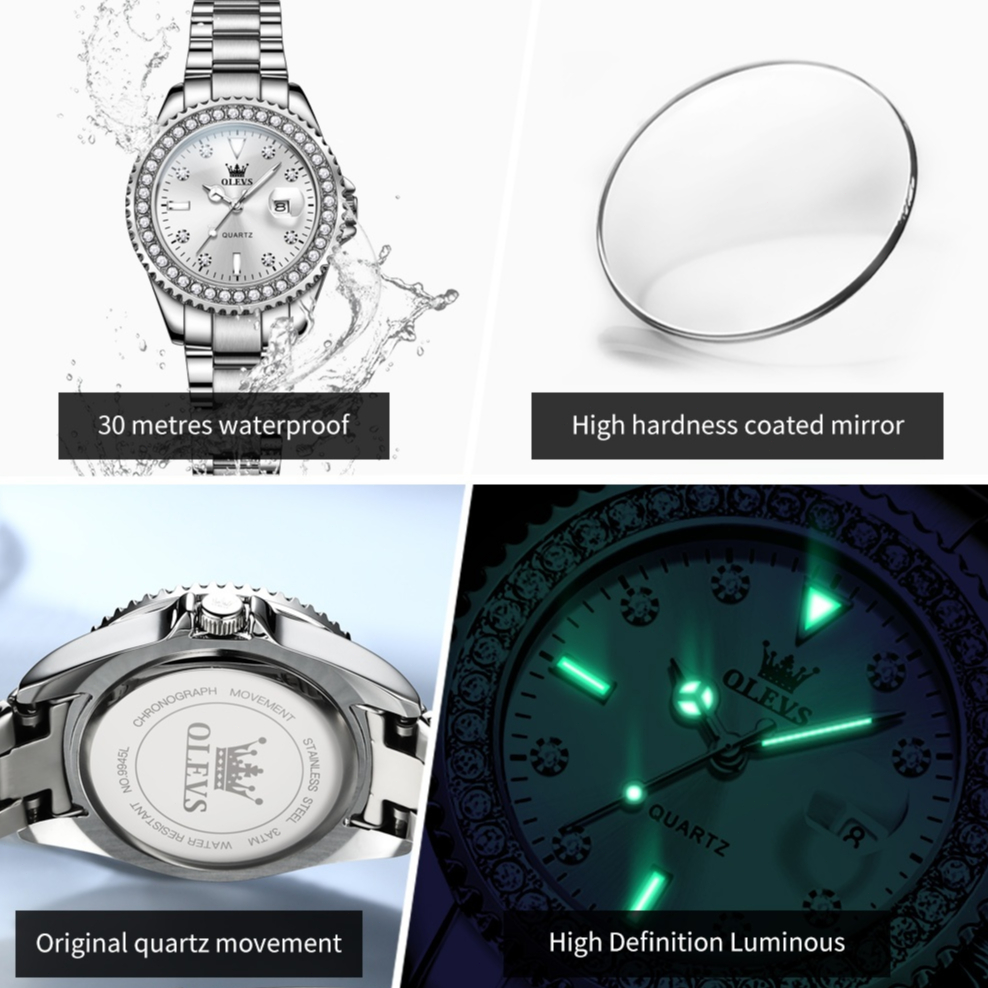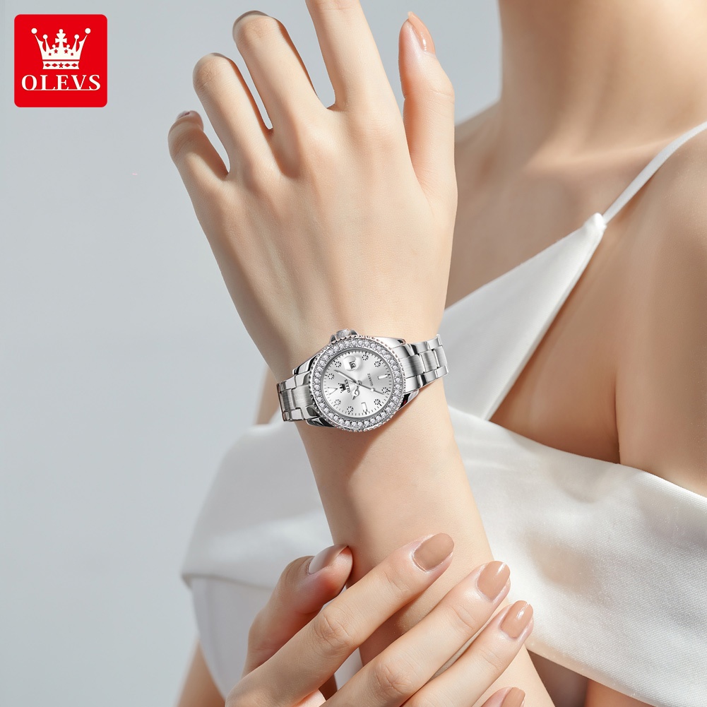 OLEVS Jam Tangan Wanita Anti Air Original 100 Diamond Pelat Berlian Fashion Putih Stainless Steel Women Watch Set Model