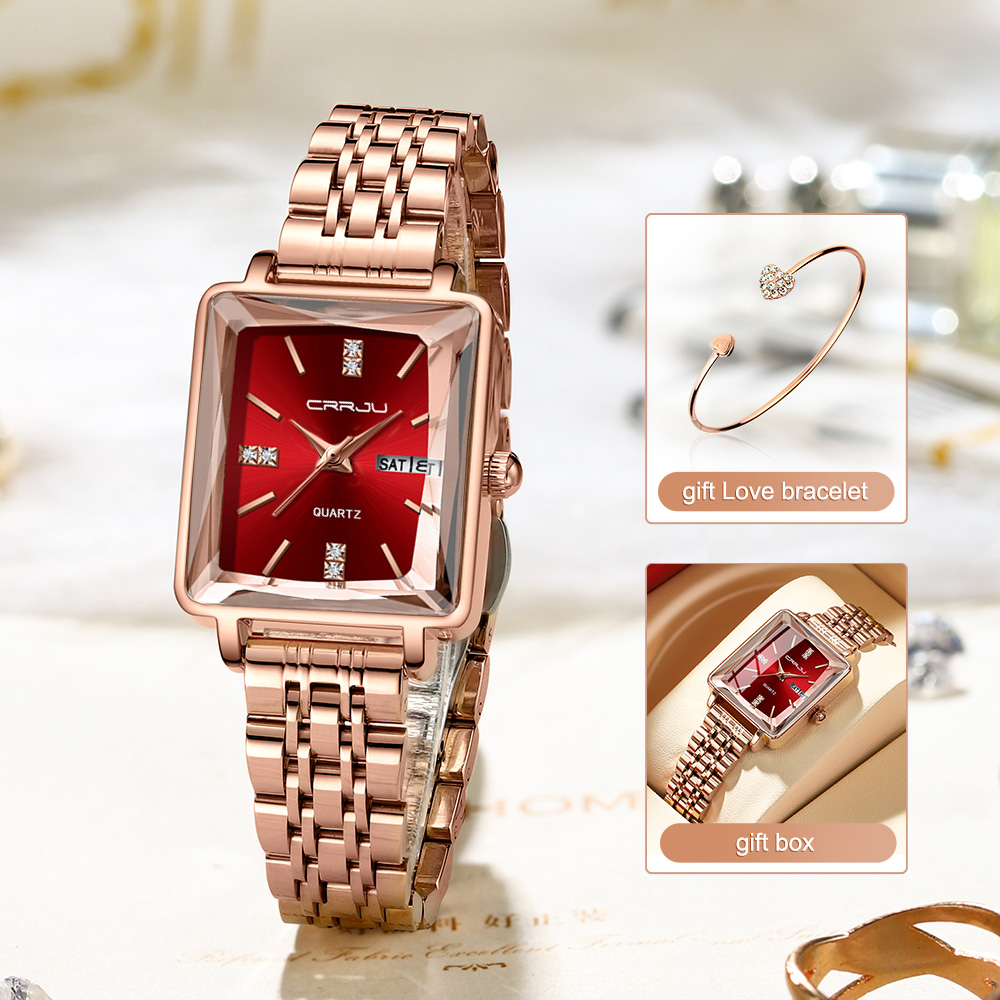 CRRJU Jam Tangan Wanita Original Anti Air Tali Stainless Steel Minggu Kalender Otomatis Jam Kuarsa Santai Mewah Jam Cowo