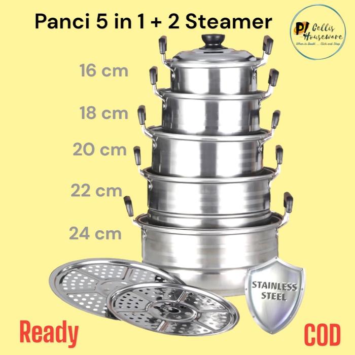 Murah Panci Set 5 in 1 Stainless Steel + 2 steamer Keren
