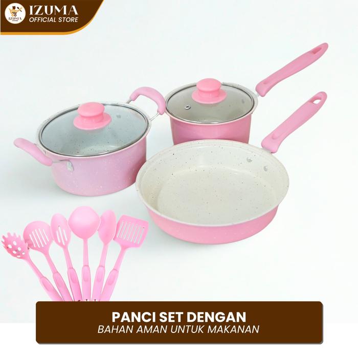 Terlaris IZUMA Panci Set 3 pcs + Free Spatula 6 pcs Lengkap Warna Frypan Saucepan Cookware Set - Biru Elegan