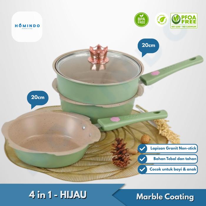 Terlaris HOMINDO Panci Set Bayi 4 Pcs Coating Granit Wajan Keramik Food Grade - Hijau Elegan