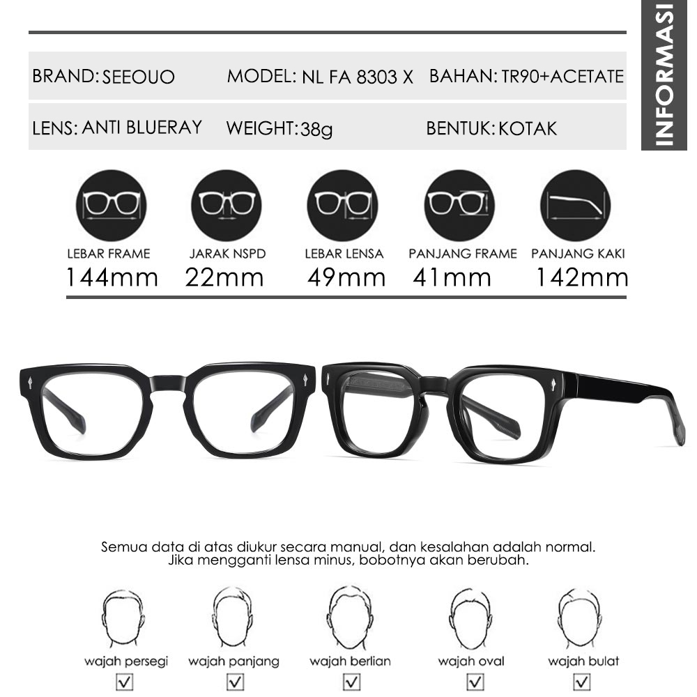 Seeouo Kacamata Antiradiasi Blueray Kotak Bold Stylish Fashion Pria Wanita TR90+Acetate Bisa Minus Photocromic Kokoh 830