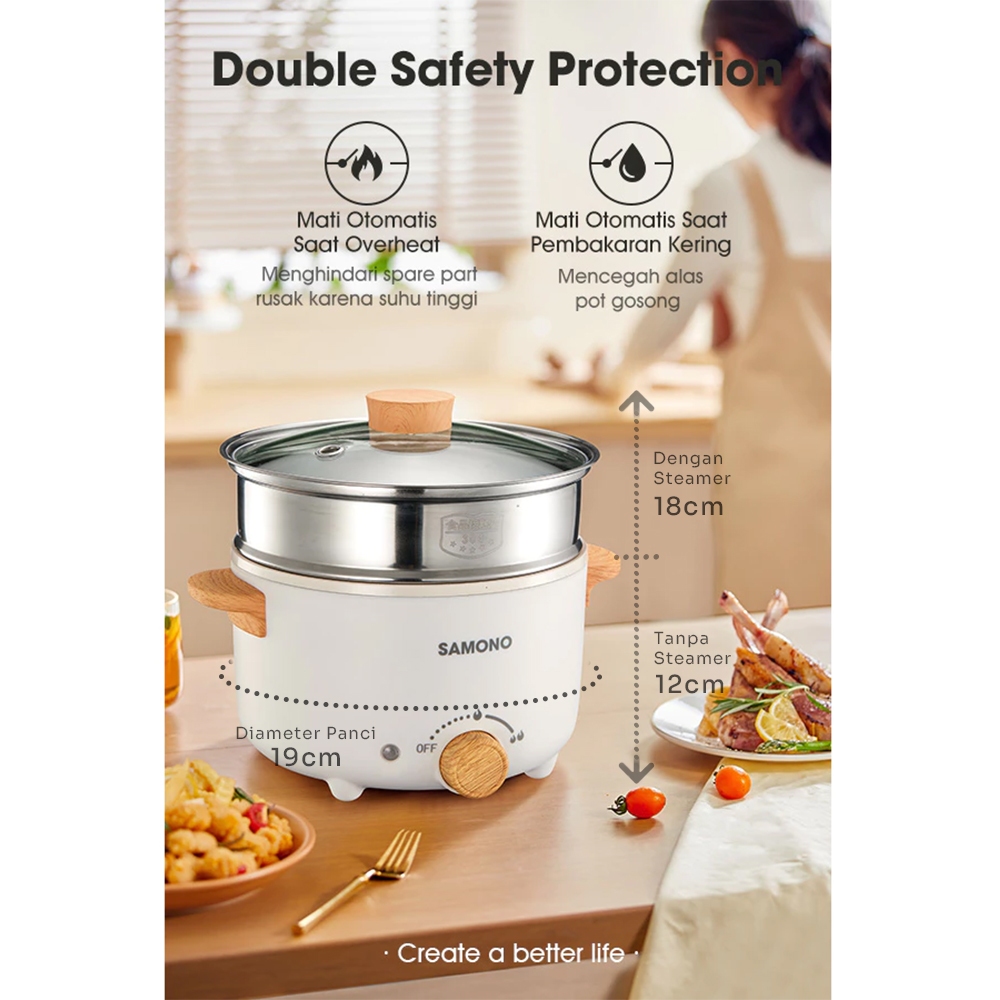 SAMONO Panci Listrik 2.4L Anti Lengket Teflon Keramik Kukusan Stainless 1.6L Serbaguna Low Watt SW-DG01S