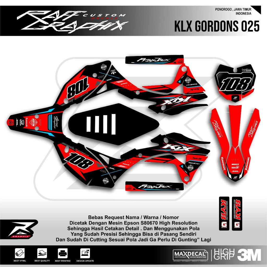 DECAL KLX BODY GORDON KODE 025 / DECAL KLX 150 / STICKER KLX GORDONS SUPER GLOSY
