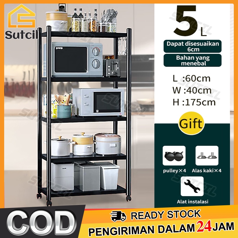 Rak Susun Serbaa Dapur Stainless Steel Rak Dapur Multi-Lapisan Rak 5 Susun Penyimpanan Microwave Oven Dengan roda
