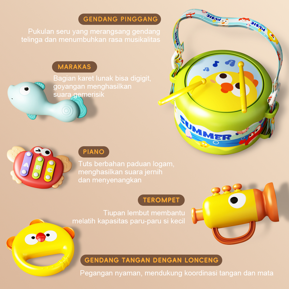 Mainan Bayi Drum Set 5 in 1 Mini Musik Drum 0 -3 Tahun Mainan Anak Edukasi Mainan Instrumen Perkusi