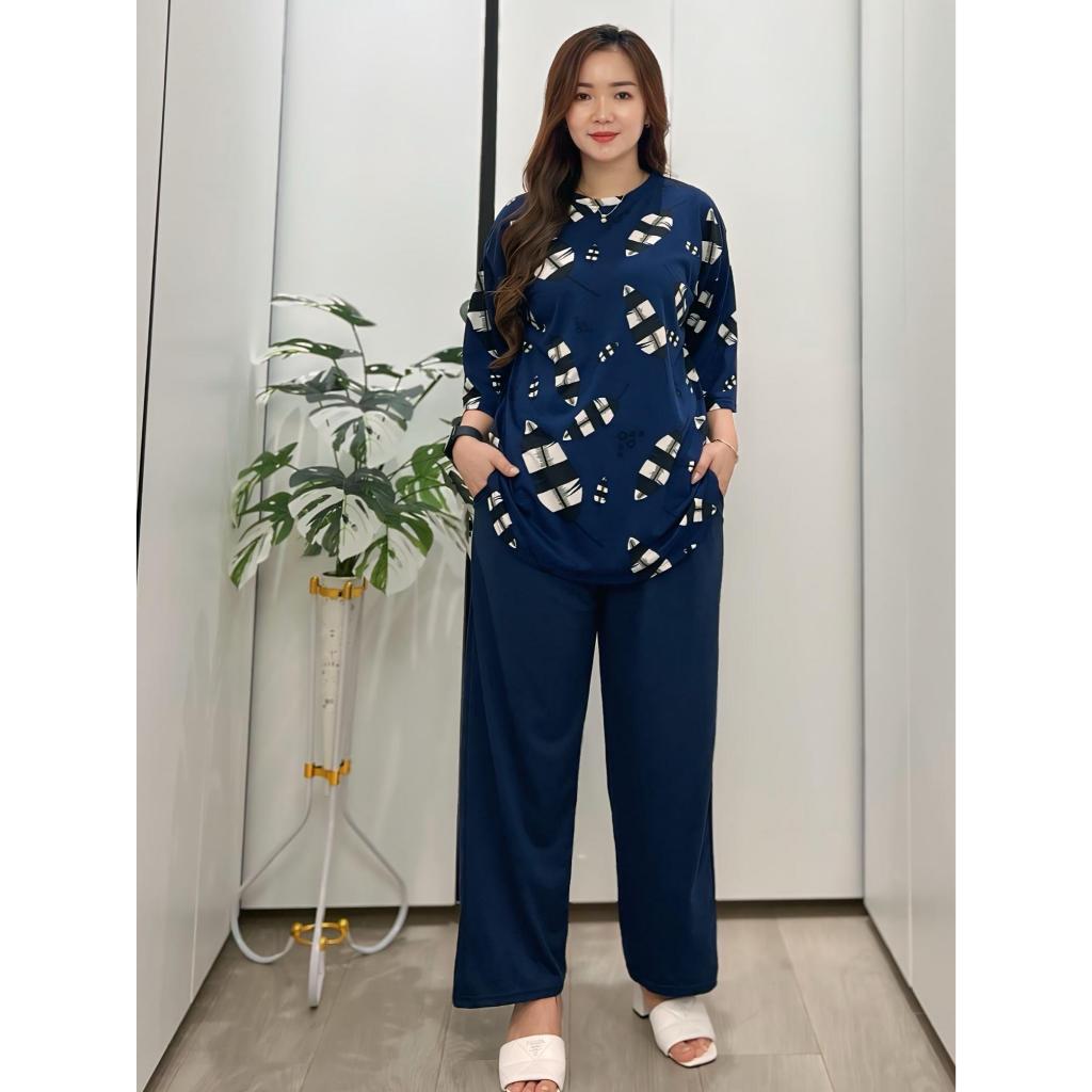 Setelan Wanita Terbaru LD 120 cm Motif Full Print Atasan el Oval Lengan 3/4 dan Celana Panjang Oneset Fashion Muslim SR5