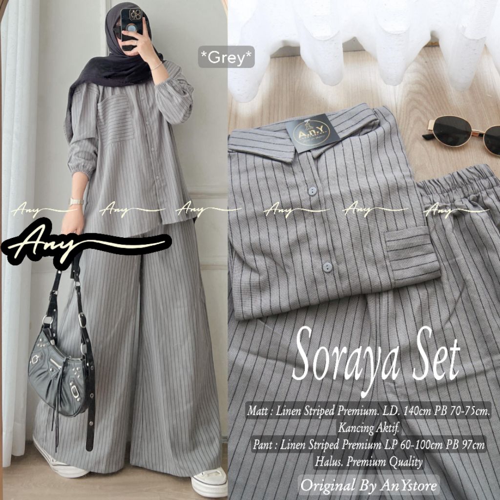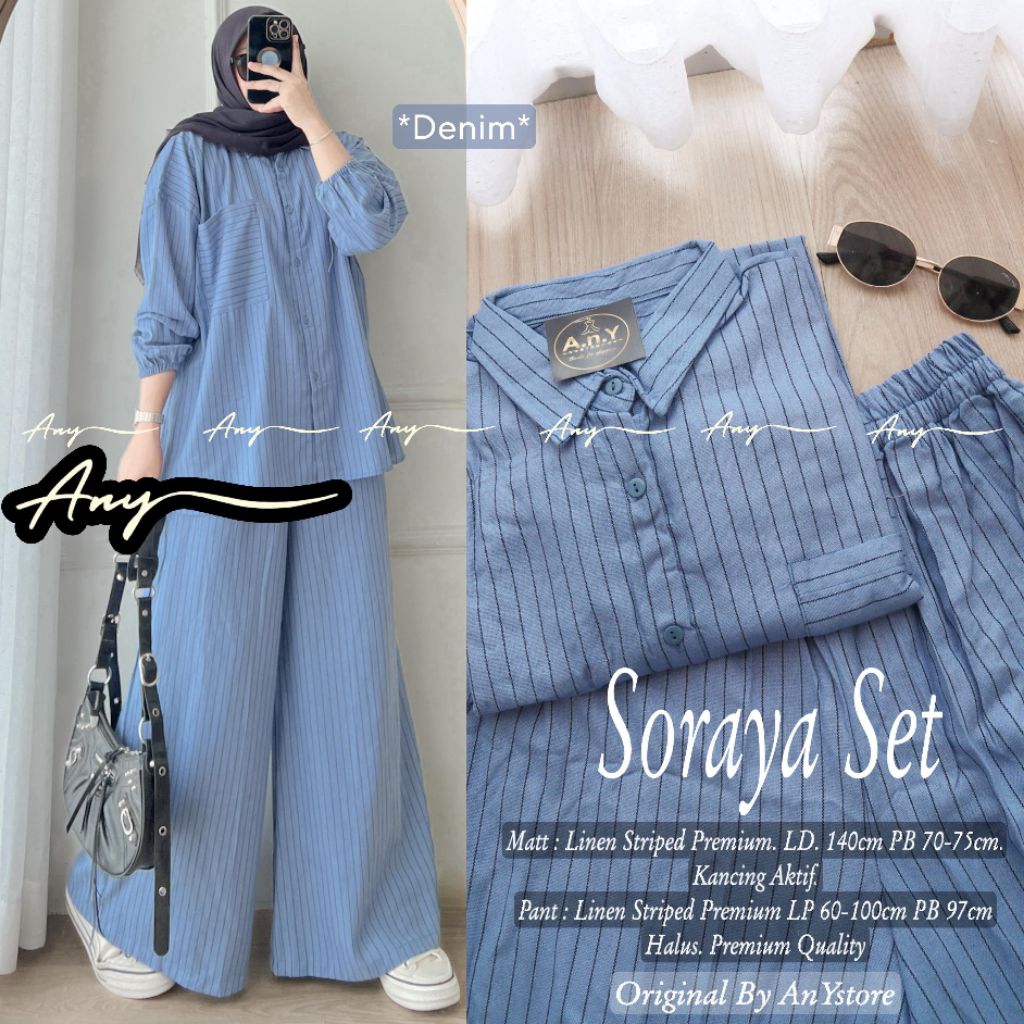 Soraya Set setelan atasan dan celana panjang linen striped Premium outfit kampus kerja kantor hangout syari kekinian daily set one set wanita by ANY