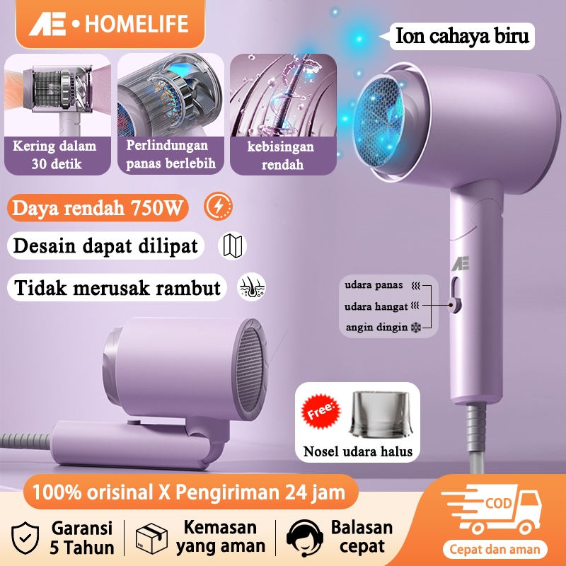 AE Hair Dryer Low Watt 750W Lipat 90° Portable Hairdrayer Pengering Rambut Negative Lon 3 Tingkat Suhu Cepat Kering