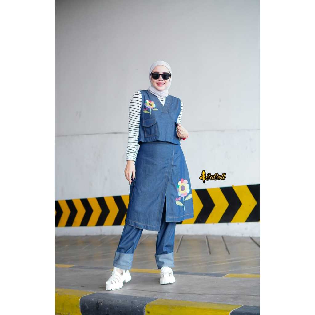 Sacoll One Set Wanita Setelan Zaura Versi Celana Rok Baju Denim Wash Mix Sablon Print Kekinian