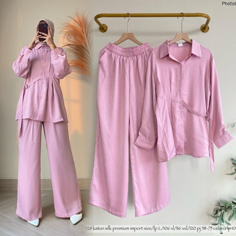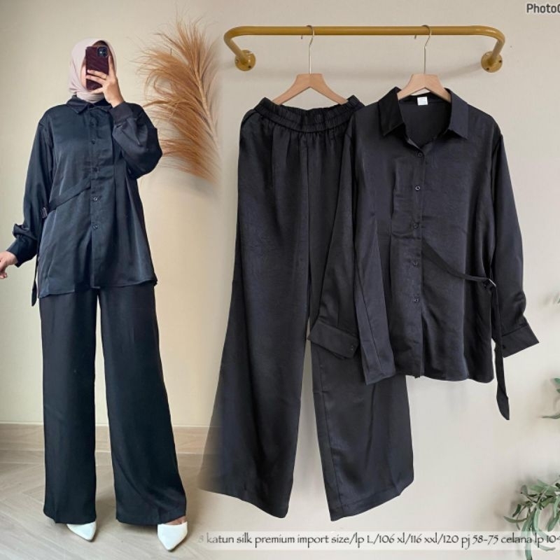 - Lucky Lacky Boutique - One Set 2in1 Set Katun Silk Premium Setelan Celana Panjang Polos Wanita Lucu Kekinian Terbaru Oversize Jumbo Korean Style Trend Bangkok